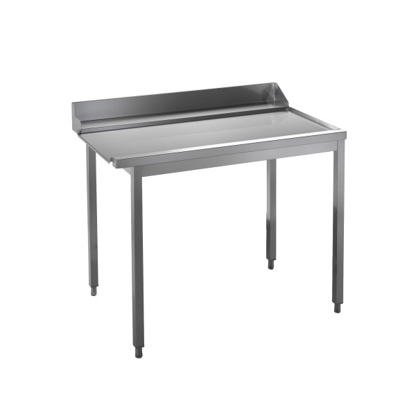 Table de sortie lave-vaisselle professionnelle en inox AISI 304 15/10ème, conçue pour optimiser la zone de dépose en fin de cycle de lavage. Idéale pour les laveries professionnelles, elle offre une surface stable, hygiénique et équipée de profilés de guidage assurant le maintien des paniers en sortie de machine. Son piètement en tube inox 40×40 mm avec vérins réglables garantit stabilité et durabilité, tandis que le dosseret 100×20 mm protège efficacement le mur. Une solution robuste, compacte et parfaite pour fluidifier l’organisation du poste de lavage.